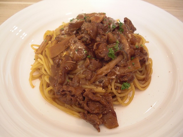 今回は、ハヤシパスタにしました。鍋いっぱいのハヤシソースを